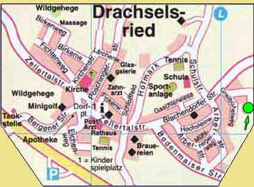 Da der Routenplaner nur den Weg nach Drachselsried angibt, haben wir unsere Ferienwohnungen mit einem grünen Pfeil auf der detaillierten Ortskarte markiert. Es dürfte somit keine Probleme geben, uns zu finden.